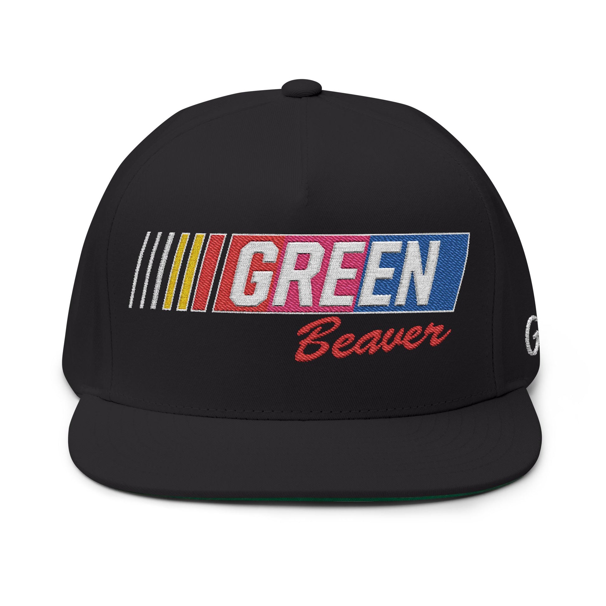 Embroidered GREENBEAVER Racing Flat Bill Cap w/ Green Underbrim
